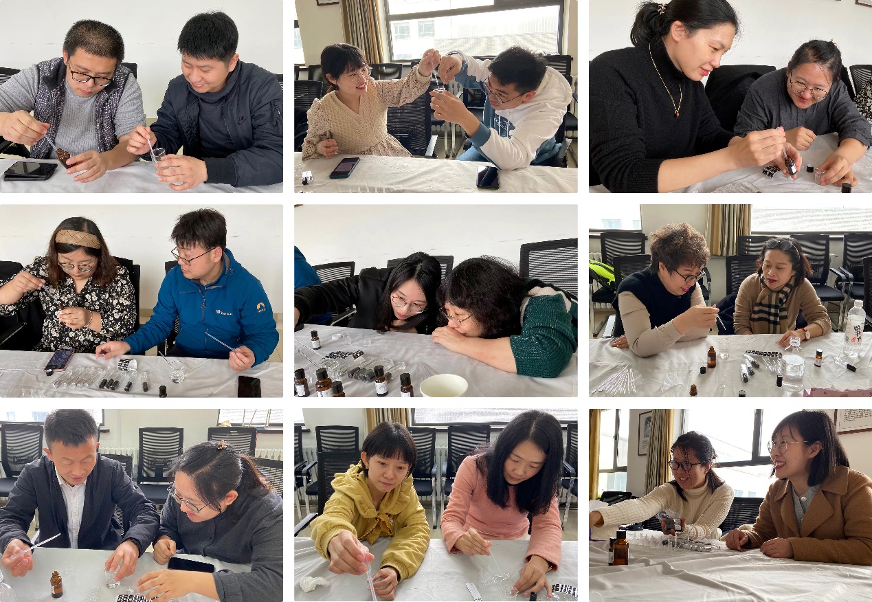 学院周琴老师为大家介绍了制作香水的原料及方法,并手把手教授大家如何进行香水的调制。在现场,老师们热情洋溢、兴致勃勃,她们拿出平时做学问的严谨作风,拿着量杯、滴管仔细地计算各种试剂的用量,力争做到准确无误,每个人都认真地制作自己的专属作品,尽情体验手工制作的喜悦。
