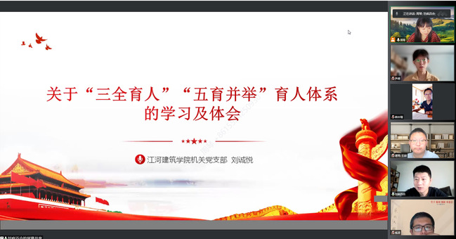 为贯彻落实全国教育大会精神和习近平总书记关于教育的重要论述,9月15日上午,学院机关党支部开展“三全育人”“五育并举”专题线上分享会,党支部全体党员参加,党支部书记周琴主持会议。