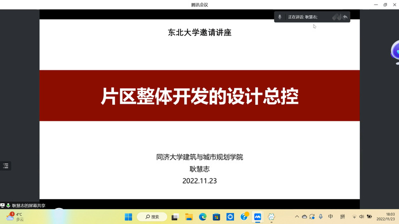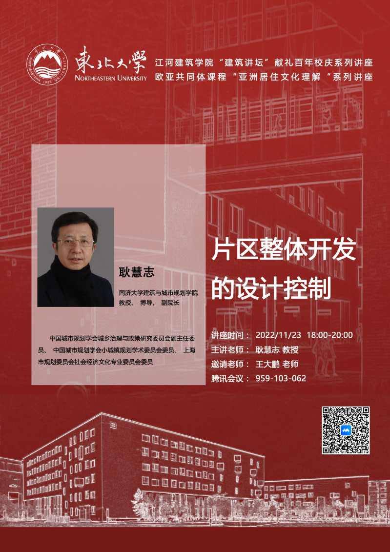 11月23日,应城乡规划系王大鹏老师邀请,同济大学建筑与城市规划学院副院长耿慧志教授做客乐动注册“建筑讲坛”(暨献礼百年校庆系列讲座),做题为《片区整体开发的设计控制》学术讲座,学院师生100余人参加线上交流。
