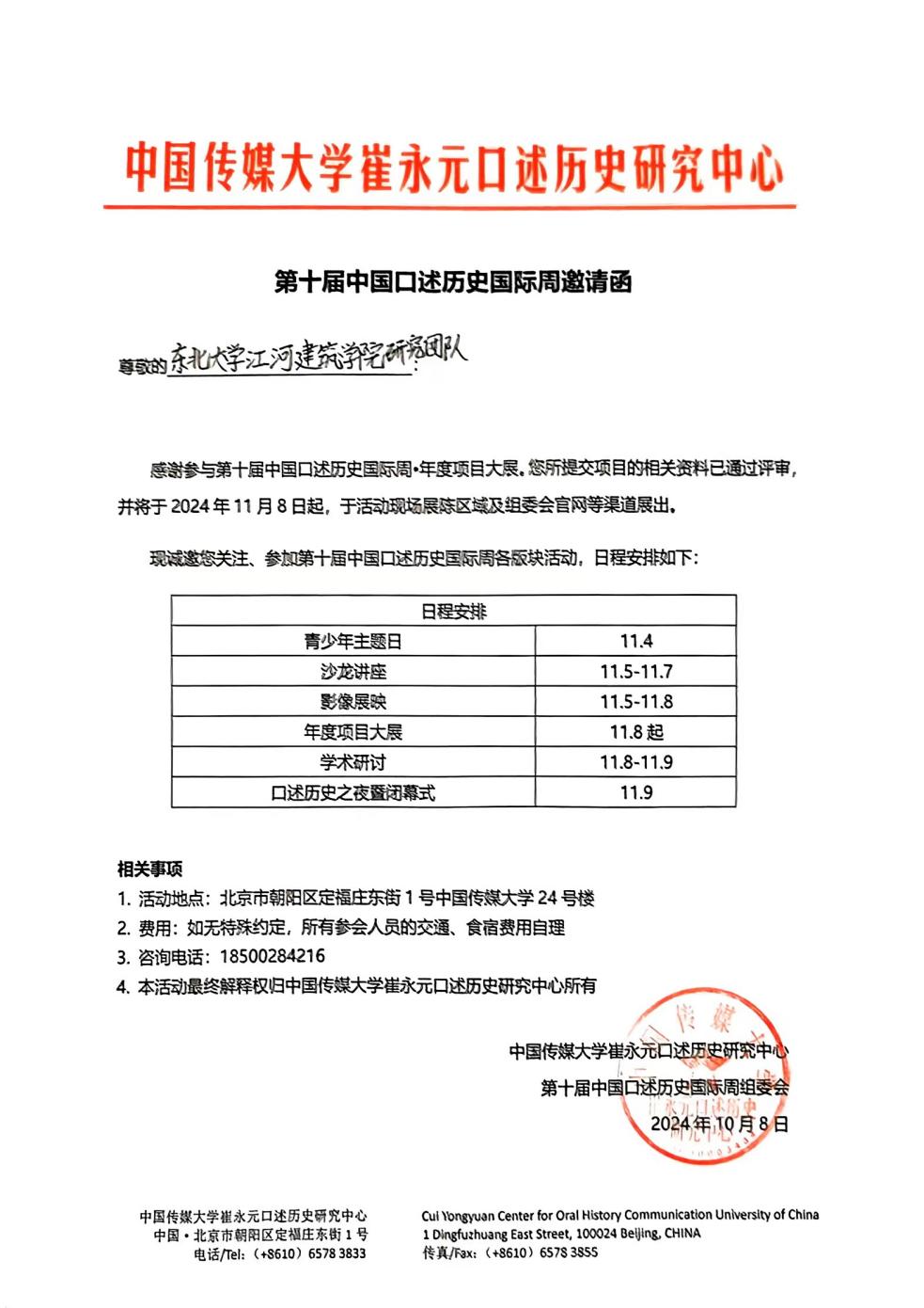 近日,由中国传媒大学主办、中国传媒大学崔永元口述历史研究中心承办的第十届中国口述历史国际周在北京举办。我院陈颖、张然老师指导的第十七批大学生创新项目“国家级优秀”项目、“最佳创意”项目——“与百年‘东大建筑’的对话”研究成果成功入选参展,参展内容包括“东大建筑记忆——口述访谈文集”“口述史视角下的科普实践纪念册”及我院原创主题文创产品等。
